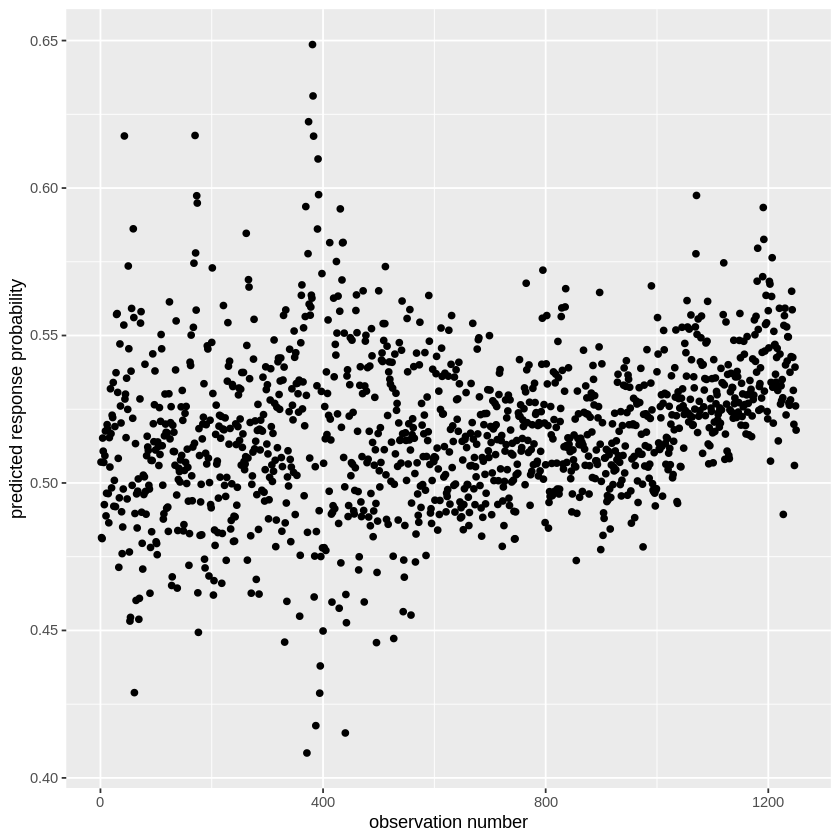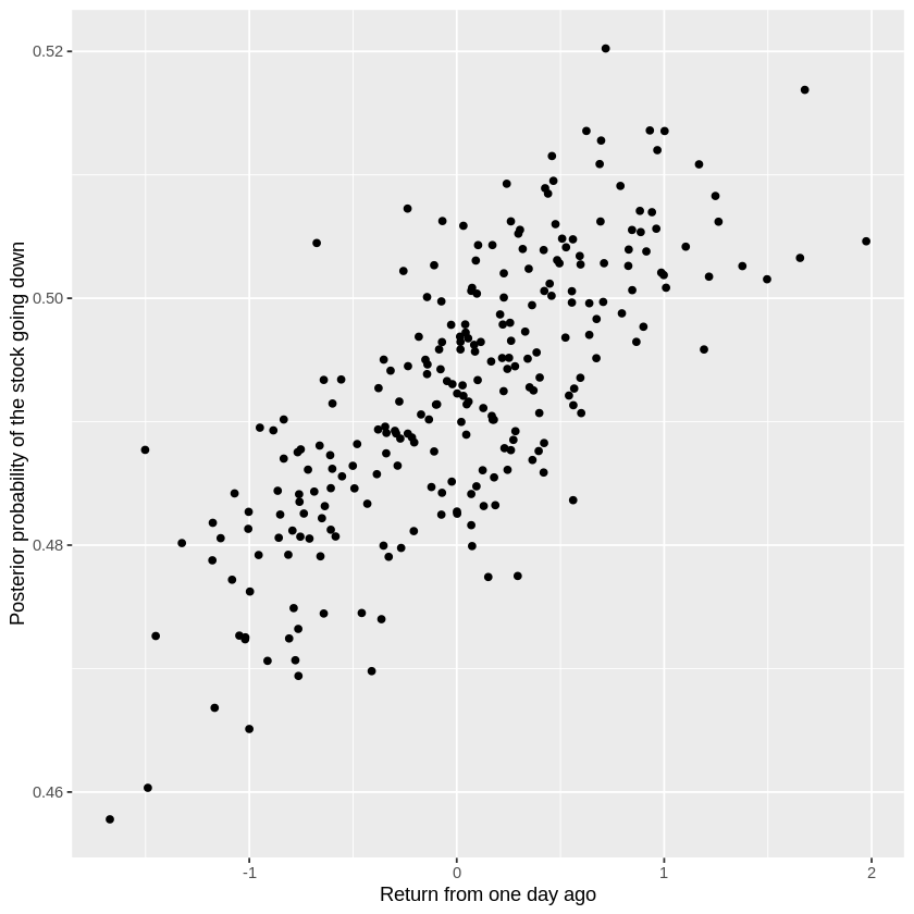 Sometimes it is more informative to look at the relationship between a predictor variable and the posterior, rather than a predictor variable and the predicted classification. It helps you distinguish between, for example, observations that are very likely to be “Down” and observations that are only somewhat likely to be “Down”.