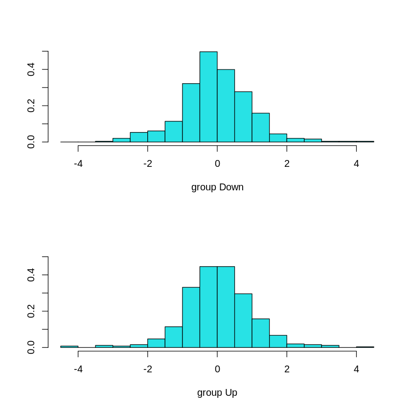 Remember that QDA is a special case of LDA where you do not assume that the underlying distributions have equal variances. So let’s use QDA for the same problem we have been working on so far. First off, let’s check how the distributions of Lag1 and Lag2 look in the case of Direction="Up" and Direction="Down". This will help us think about whether QDA might be a better tool than LDA for our question.