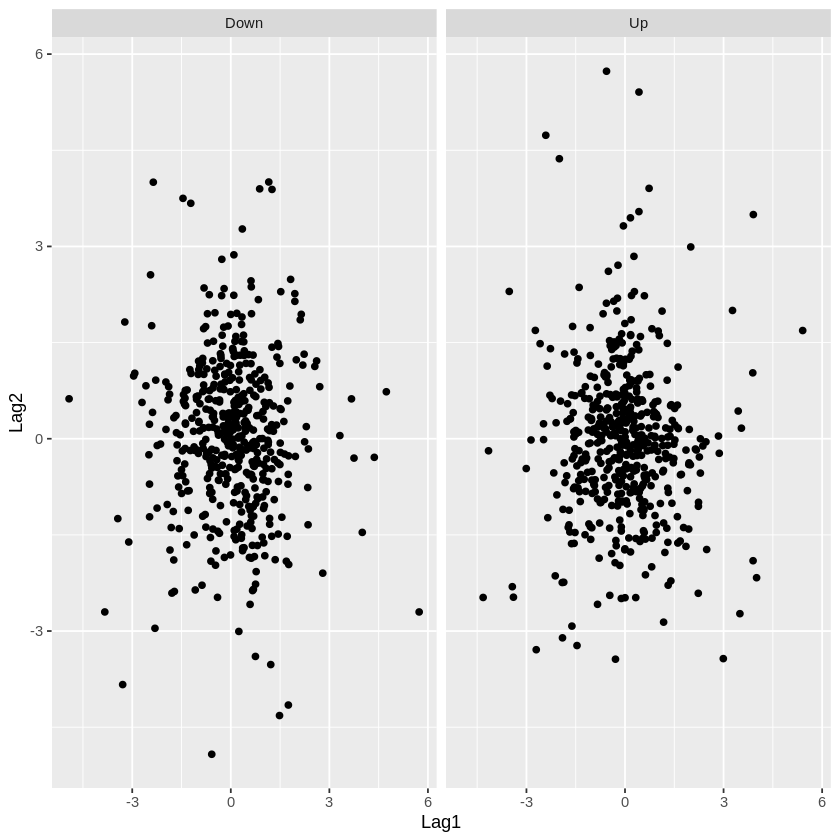 ggplot(Smarket[train_idx,],aes(x=Lag1,y=Lag2)) + geom_point() + facet_grid(.~Direction)