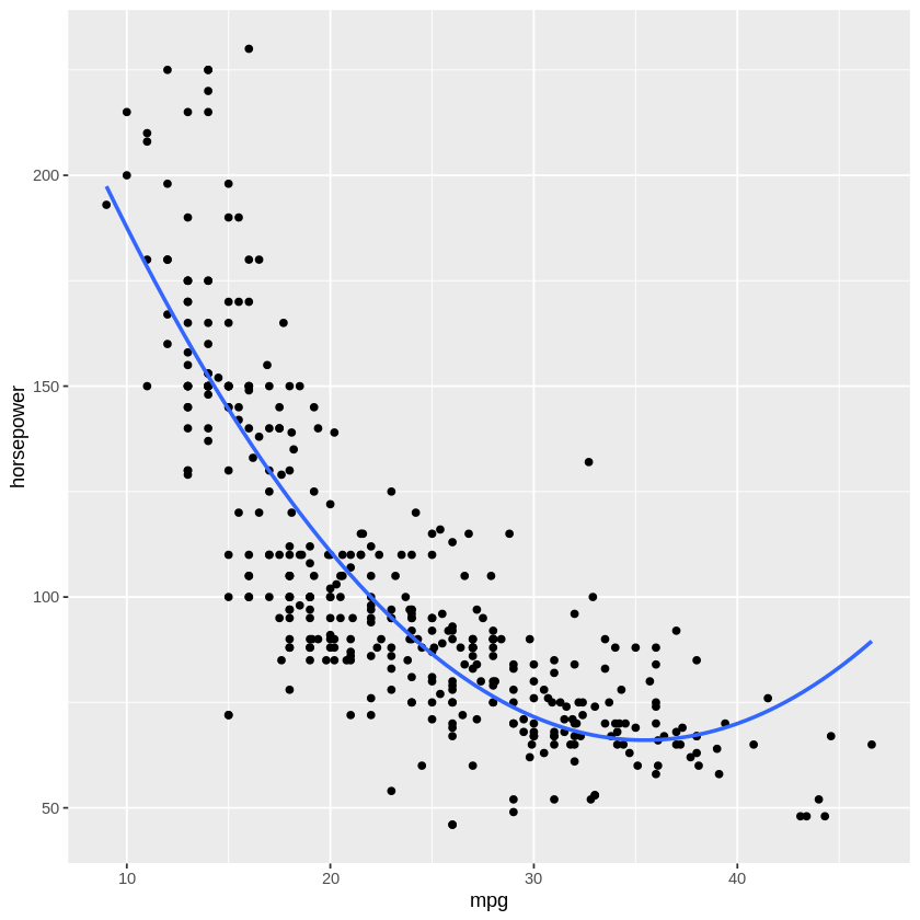 We’ll start with a simple linear regression model predicting mpg from horsepower, using the full data set.