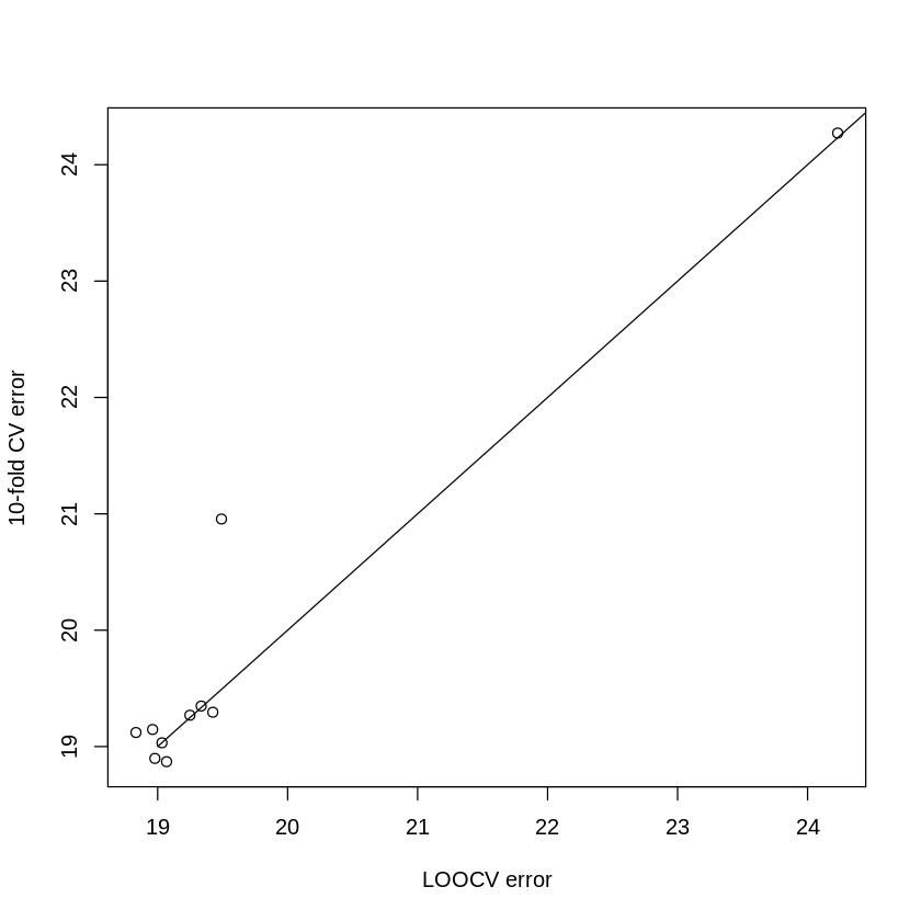 Note that if you don’t define k in the cv.glm function, the default is LOOCV. So an equivalent way to run the above model is: