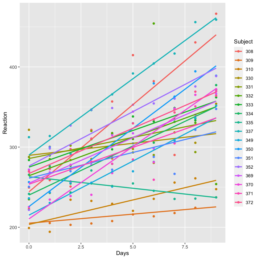 ggplot(sleepstudy, aes(Days, Reaction, color = Subject)) +