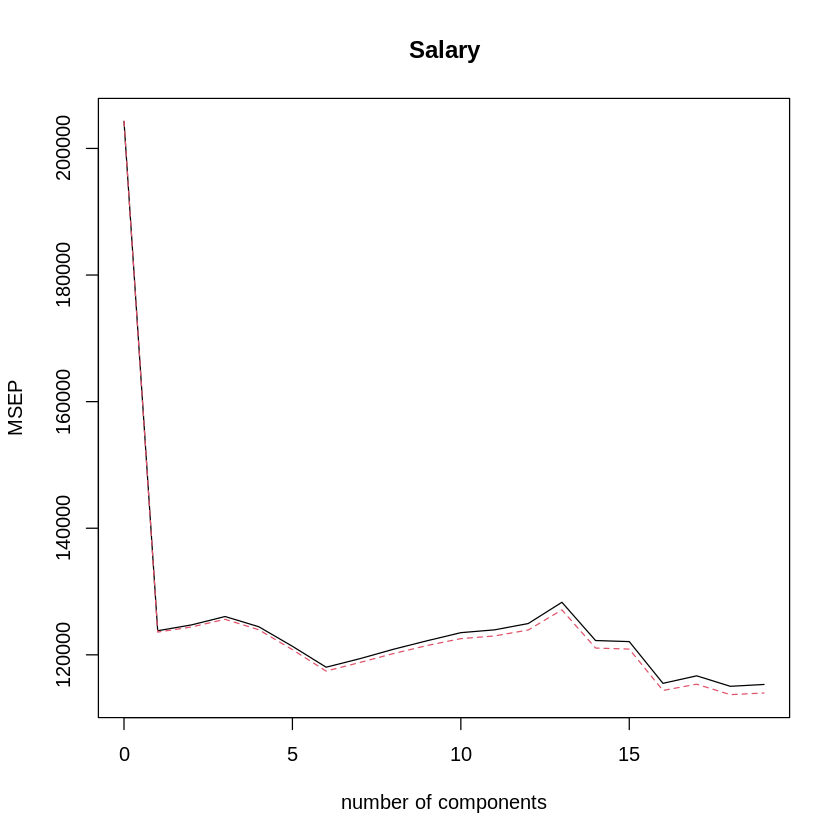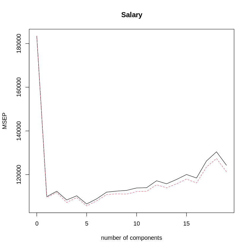 pcr.fit=pcr(Salary~., data=hit.dat,subset=train,scale=TRUE, validation ="CV") # Run cross-validated PCR fit on training set