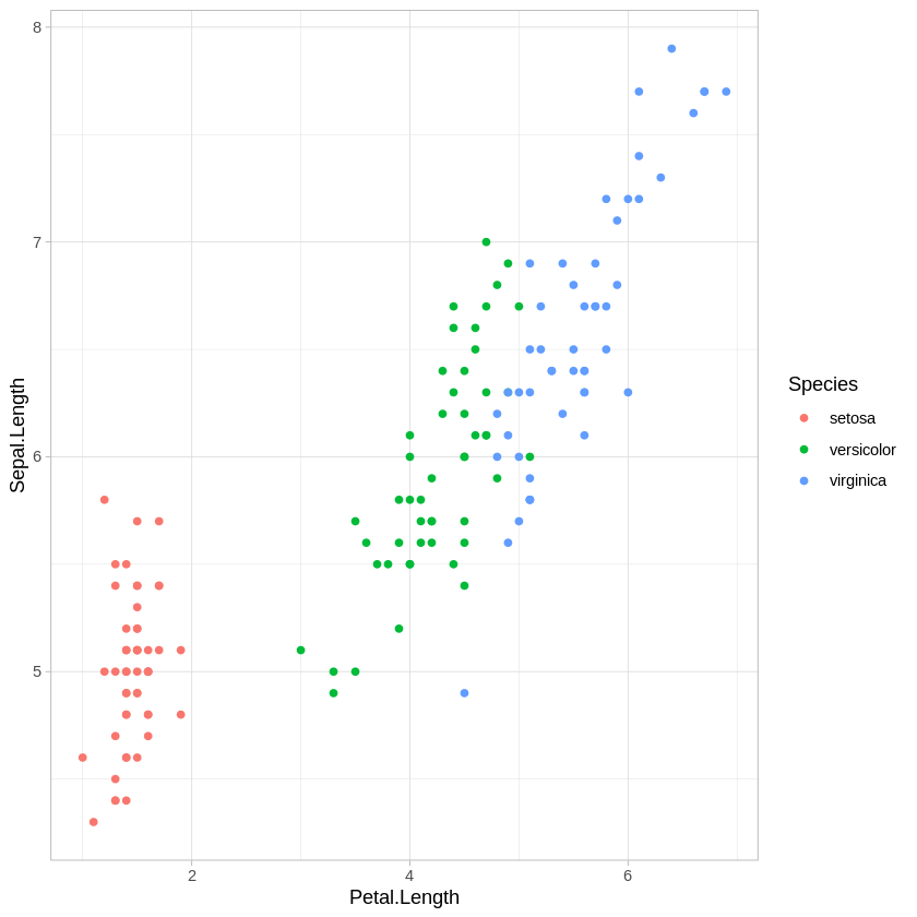 ggplot(iris,aes(x=Petal.Length, y = Sepal.Length, col=Species)) + geom_point() + theme_light()