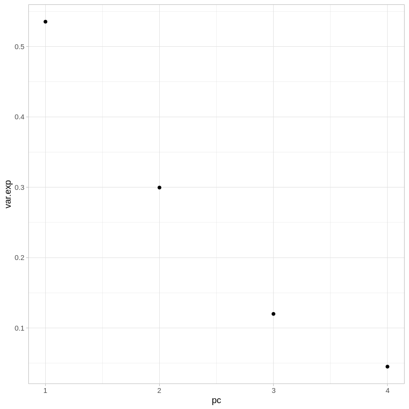 ggplot(data.frame(pc=1:4,var.exp=iris.pca$sdev/sum(iris.pca$sdev)),