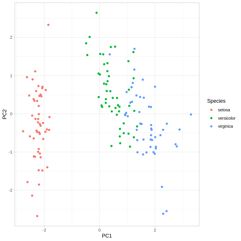 ggplot(data.frame(PC1=iris.pca$x[,1],PC2=iris.pca$x[,2],Species=iris$Species),