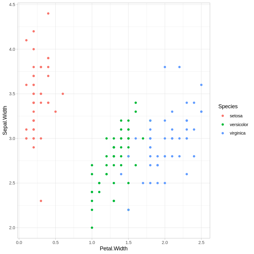 ggplot(iris,aes(x=Petal.Width, y = Sepal.Width, col=Species)) + geom_point() + theme_light()