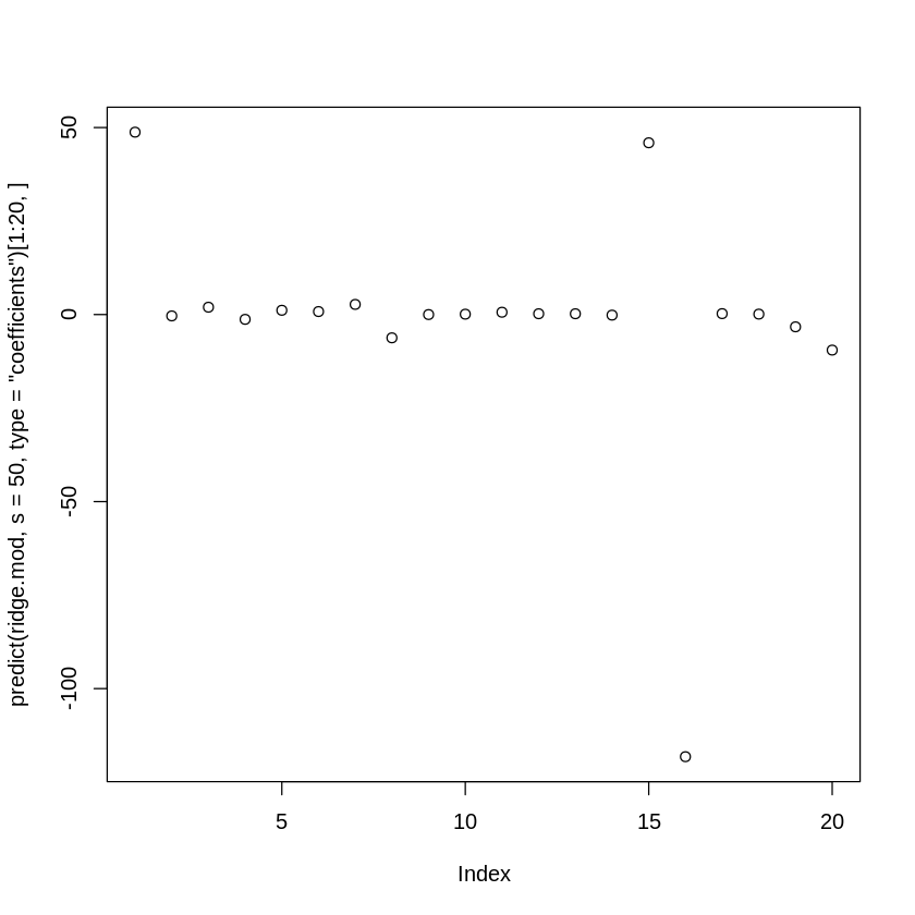 print(predict(out, type="coefficients", s=bestlam, newx=x[test_glm,])[1:20,]) # "s = bestlam" picks out the winning value and shows those coefs.