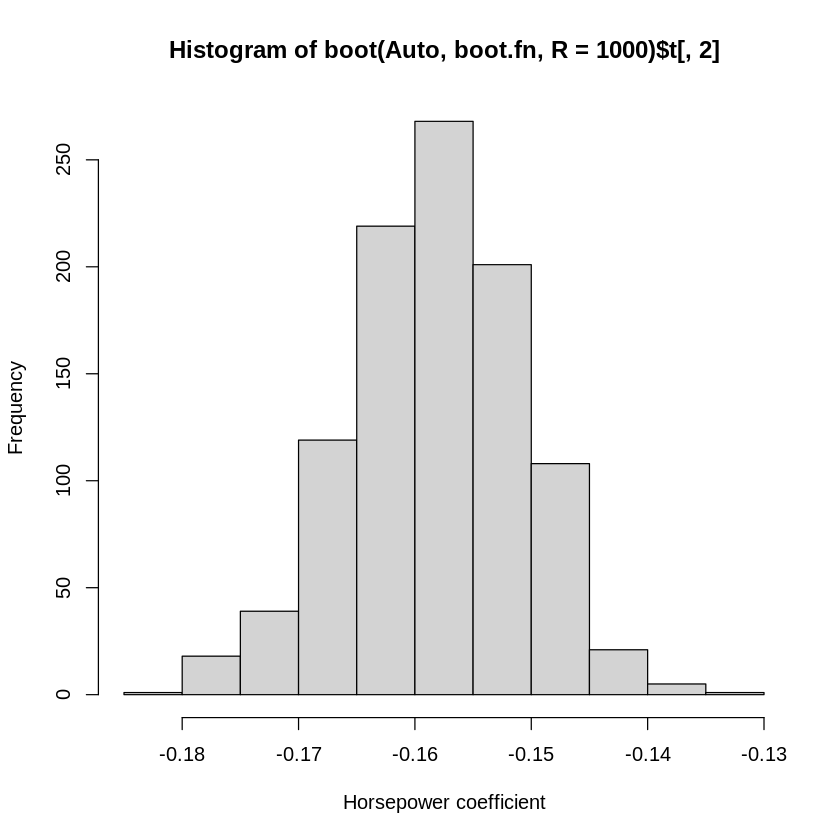 hist(boot(Auto ,boot.fn ,R=1000)$t[,2], xlab="Horsepower coefficient") #we get a distribution of all of the estimates