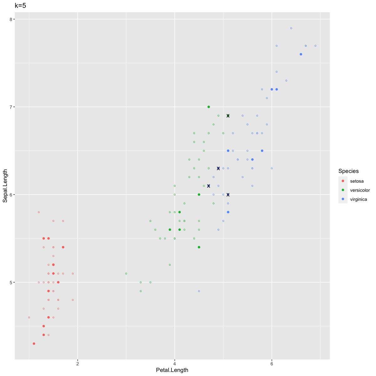 aes(x=Petal.Length,y=Sepal.Length),shape="x",col="black",size=4) +