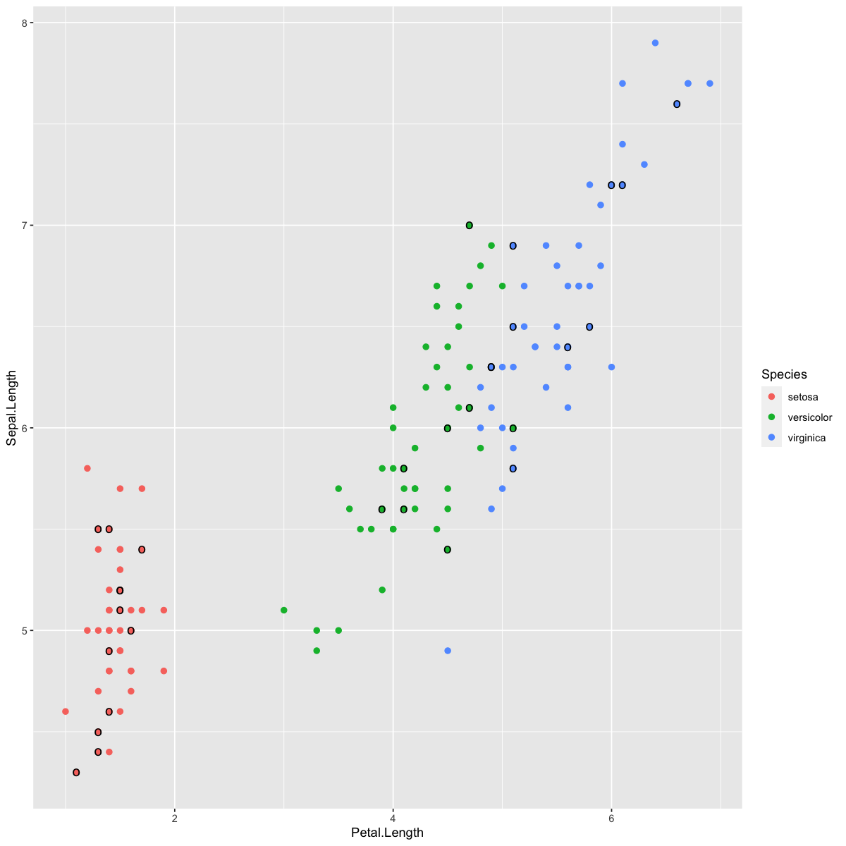 geom_point(data=dat[test.inds,],aes(x=Petal.Length,y=Sepal.Length),size=4,color="black",shape="o")