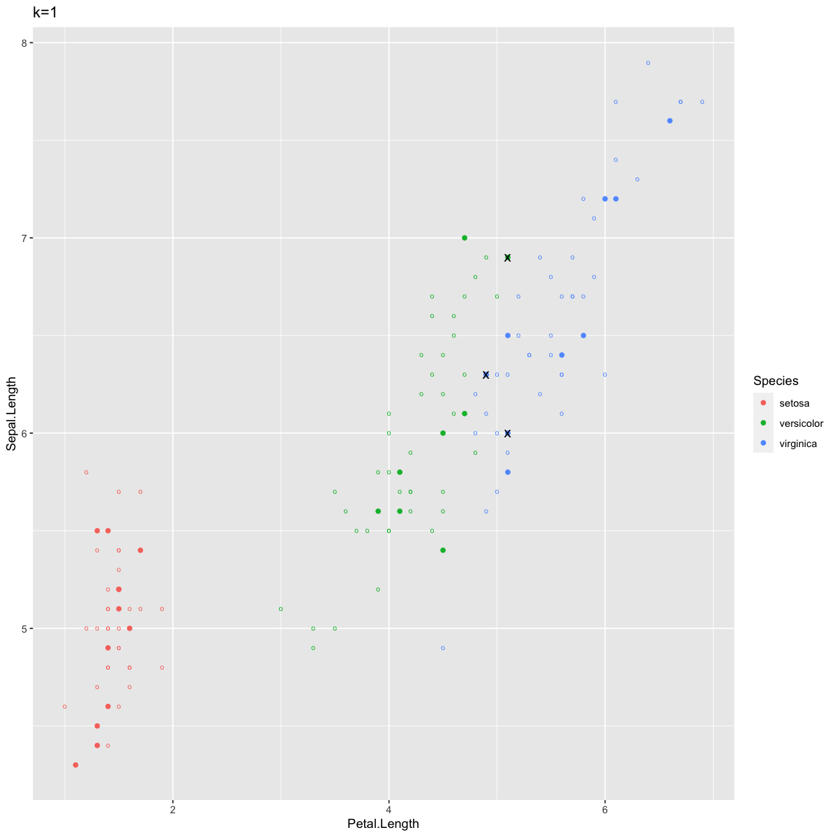Since the plotting got a little confusing there, I’ll just summarize: the circles are training data, the solid points are test data, colored by their KNN predicted species, and the ones marked with an “x” are incorrect predictions.