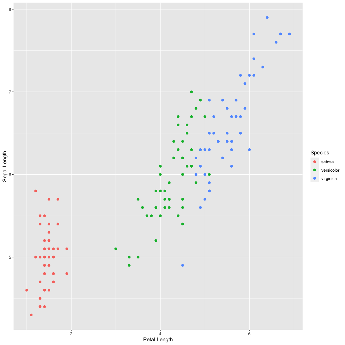 ggplot(dat,aes(x=Petal.Length,y=Sepal.Length,col=Species)) +