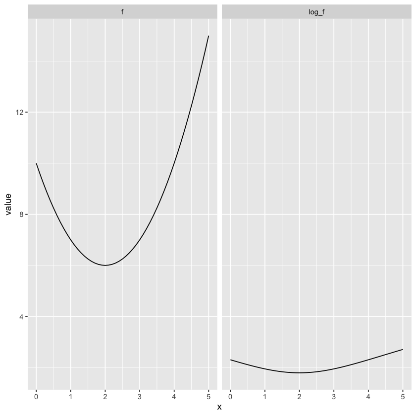 Even though the log transformation is flatter than the original function, it still has a minimum at x = 2.